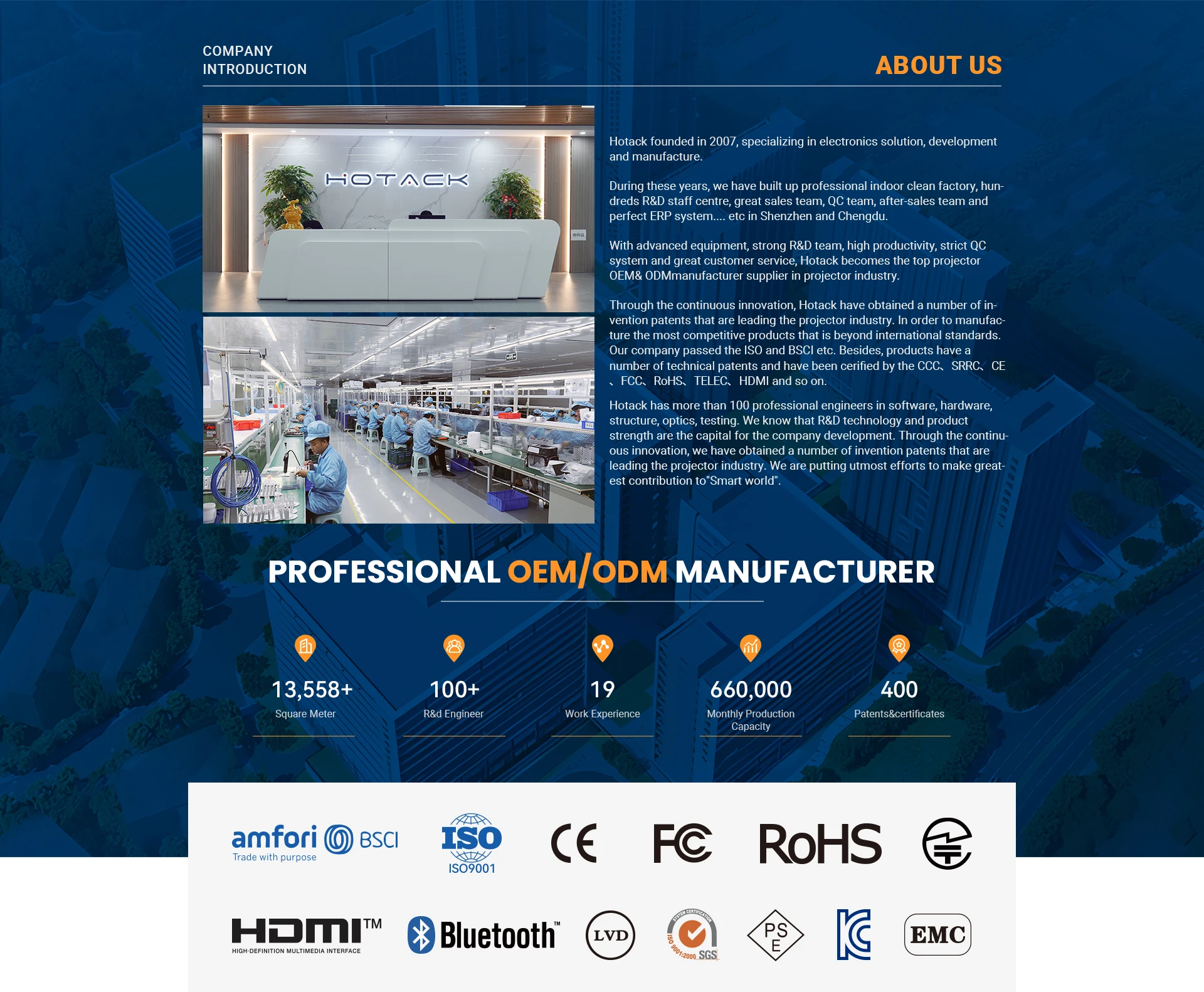 Hotack, as a professional second-developer of Rockchip, is a solution company specializing in designing, engineering and manufacturing of smart products for over 16 years. We have strong engineer team to develop and produce different kind smart projector. And we are second developer of Rockchip, provide global ODM/OEM services and solutions based on Rockchip 3128, 3229, 3288, 3328, 3368, 3399 and so on. High quality and humanization desigh products have win large share in oversea market.